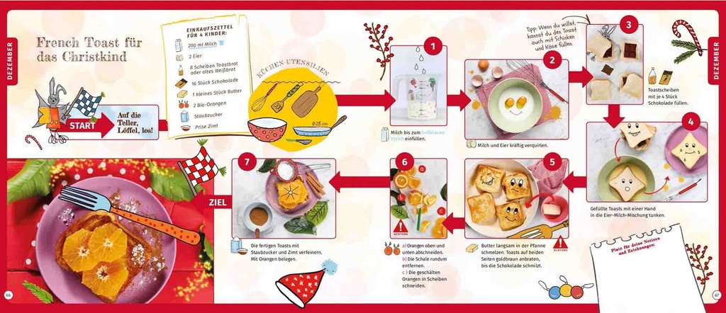 - Schritt-für-Schritt-Anleitungen mit bunten Bildern in Form eines Spielfeldes.