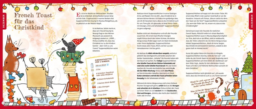 Eines Tages, überreicht die alte, weise Eule, dem kleinen Flederhasen BatiLoo ein magisches Kochbuch. Sie schickt ihn auf eine Reise, voller neuer Abenteuer und karottig toller Freundschaften. Wen er auf seinem Weg kennenlernt und was er mit seinen neuen Freunden erlebt, erfahrt ihr in: Auf die Teller, Löffel, los! Was tun die Freunde, dass die kleine Kängurumaus endlich einschlafen kann? Wer gewinnt den Kartoffel-Schäl-Wettbewerb? Und was bekommt Batiloo zu seinem Geburtstag?